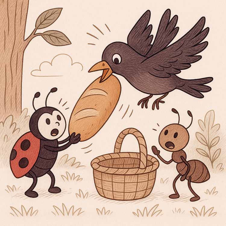 "Tabii ki! Ne demek!" dedi Karınca ve birlikte ekmek parçasını uğur böceğinin sepetine yerleştirdiler.